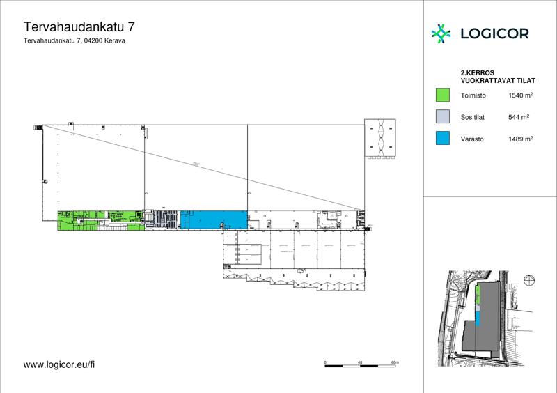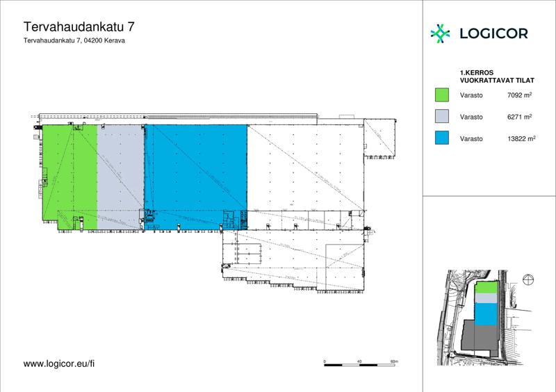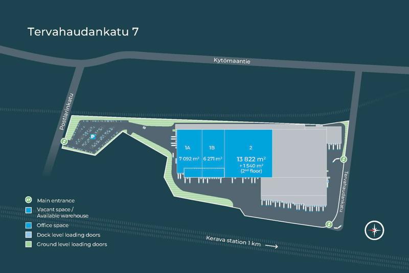 Distribution Centre Tervahaudankatu 7 is located in Kerava, 30 km north of Helsinki with an easy access to highway E75 connecting the property to Helsinki, Lahti, airport, Vuosaari harbour and other parts of Finland. The property was built 1981 and the latest extension has been finalized 2010. The distribution centre consists of cross-docking warehouse and second floor ancillary office space totalling 68 000 sqm with clear hight of 12 m, 60 loading doors and with its own rail connection.